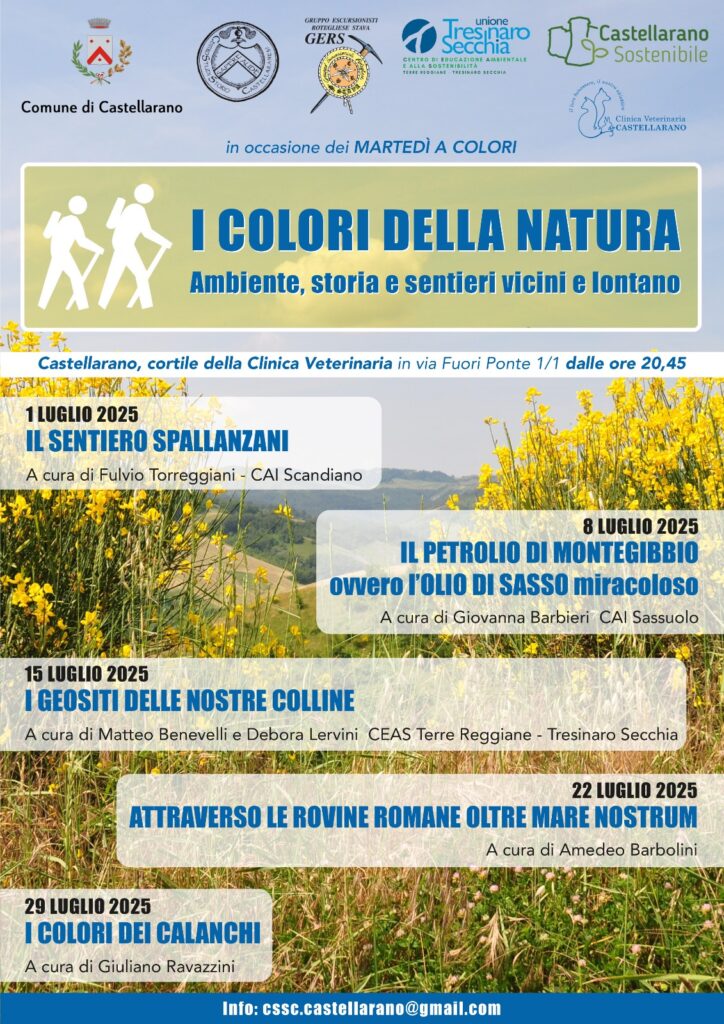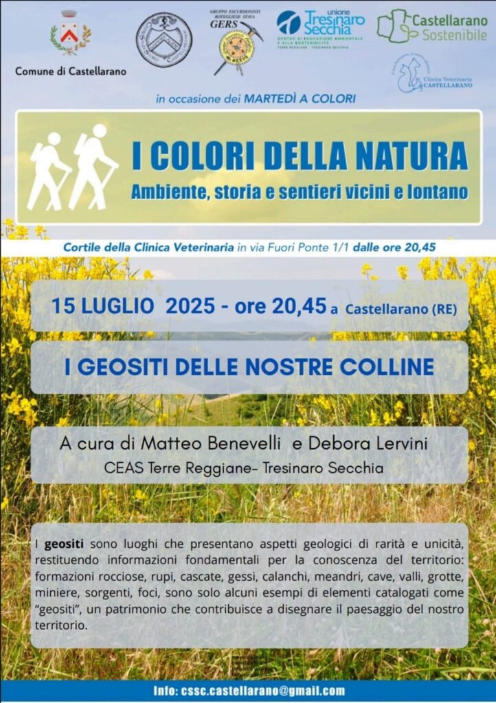 9 Luglio 2025All’interno del ciclo “I COLORI DELLA NATURA. Ambiente, storia e sentieri vicini e lontano”, martedì 15 luglio 2025 si svolgerà l’incontro “I GEOSITI DELLE NOSTRE COLLINE”. A cura di Matteo Benevelli e Debora Lervini, CEAS Terre Reggiane – Tresinaro Secchia. La serata avrà luogo a Castellarano, nel cortile della Clinica Veterinaria in via Fuori Ponte 1/1 dalle ore 20,45.