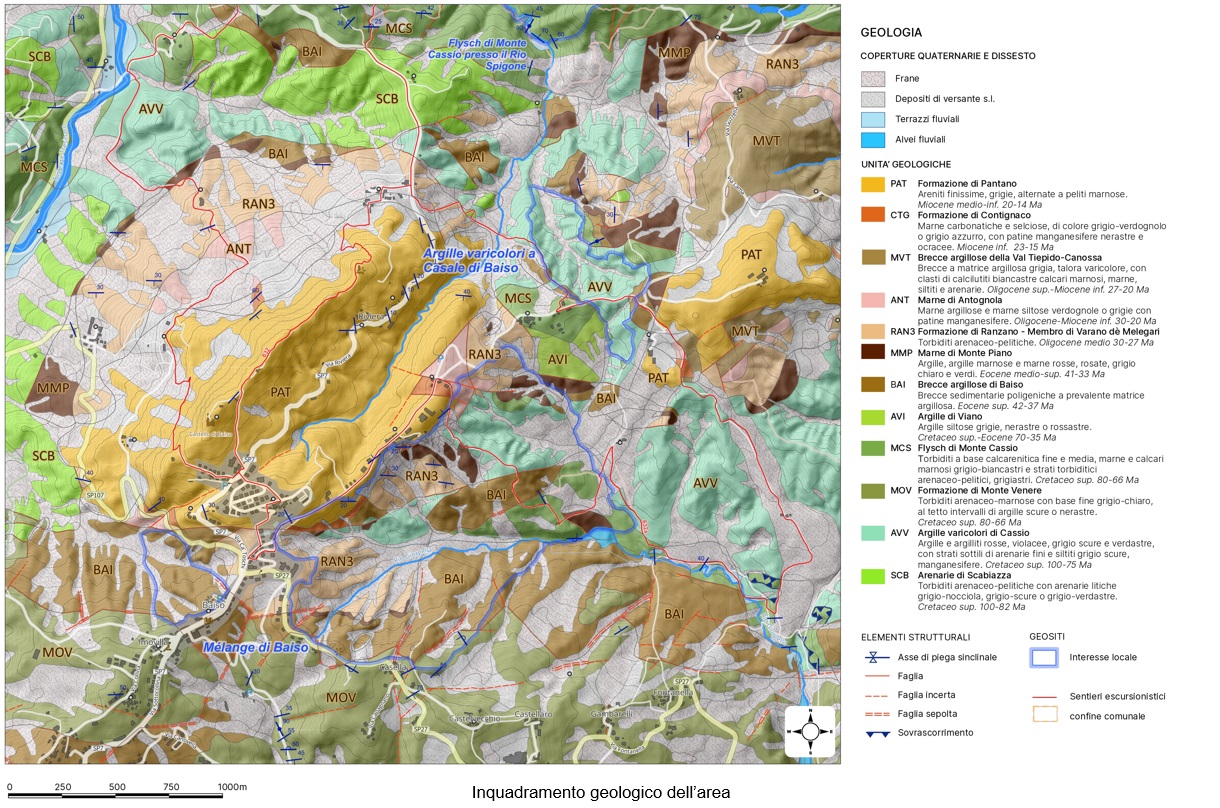 In quest’area, modellata in creste e solchi assai pronunciati e con notevole risalto nel paesaggio, affiora un complesso mosaico di formazioni geologiche, a contatto tettonico fra loro: le più antiche unità Liguri (Argille Varicolori di Cassio – AVV e Flysch di Monte Cassio – MCS), e le più recenti unità del contesto Epiligure inferiore (fra cui, dal basso, troviamo: Brecce Argillose di Baiso – BAI, Marne di Monte Piano – MMP e Formazione di Ranzano – RAN). Quest’area, in particolare, presenta la massima estensione delle caratteristiche Brecce Argillose di Baiso, tanto che questi affioramenti rappresentano l’area di riferimento. Si tratta di un mélange sedimentario terziario che rappresenta l’inizio della sedimentazione Epiligure al di sopra delle più antiche Liguridi. Le Brecce Argillose (BAI) si presentano con un colore di insieme grigio-verdastro, dove nella matrice argillosa prevalente si trovano inclusi frammenti lapidei arenacei e calcarei provenienti da formazioni geologiche più antiche (come AVV e MCS). All’interno del geosito, i lembi rossastri testimoniano, invece, le più antiche argille varicolori (AVV) mentre quelli grigio-rosati le più recenti Marne di Monte Piano (MMP).