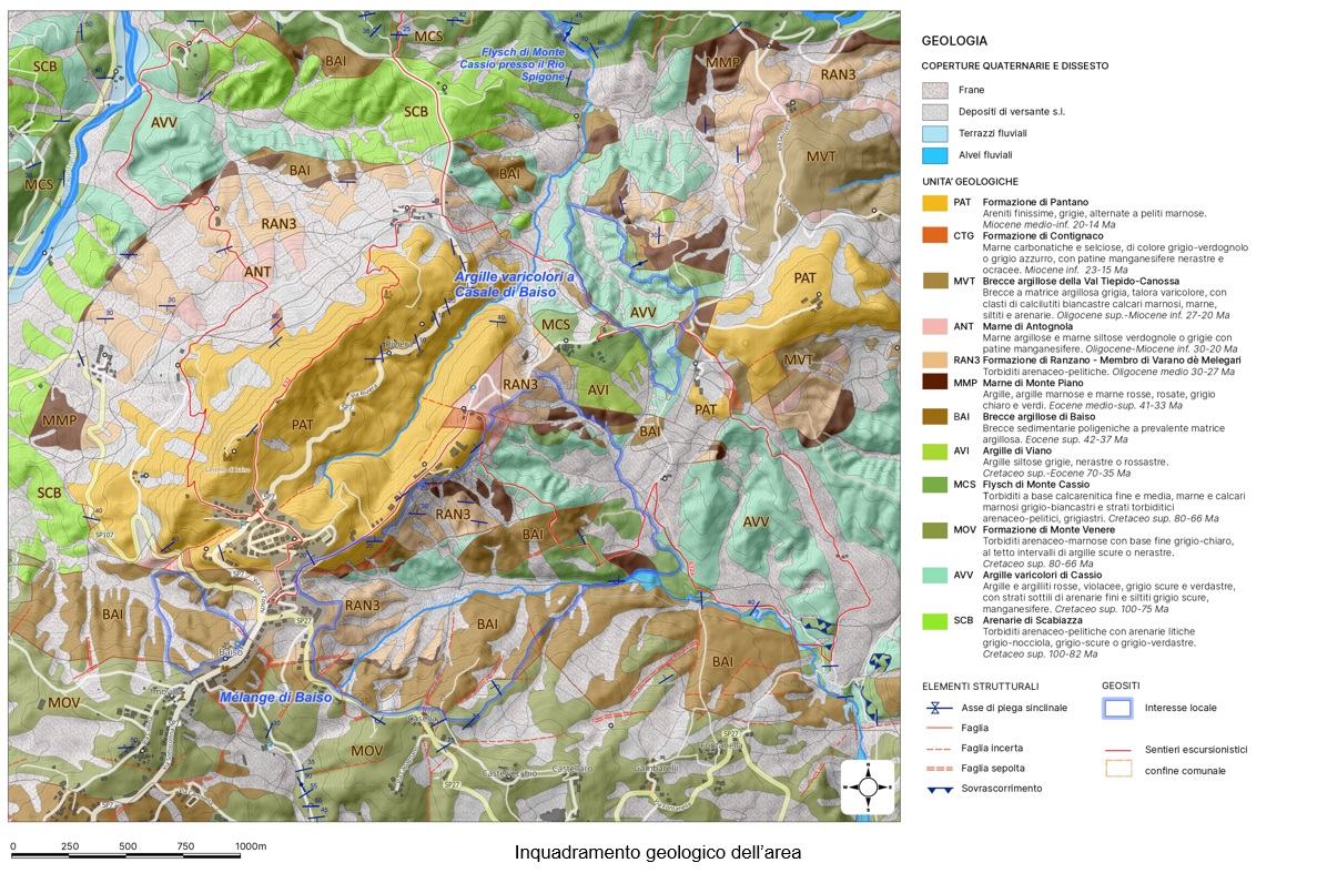 Il Geosito delle Argille Varicolori a Casale è costituito da bacini calanchivi situati lungo il crinale che separa il rio Giorgella dal rio Spigone, caratterizzati dall’affioramento delle Argille Varicolori di Cassio. Questa formazione è composta da strati di antiche argille, depositatesi tra i 100 ed i 80 milioni di anni fa sul fondo di un ramo dell’antico oceano della Tetide. Le argille sono il risultato di complessi processi sedimentari e successivamente tettonici, che le hanno rese scagliettose e fragili. A seguito della collisione fra la placca europea e quella africana (Adria), l’oceano si chiuse e queste argille vennero trasportate per oltre 100 km dal loro luogo di origine, fino ad essere inglobate nella catena appenninica, dove oggi affiorano visibilmente nel paesaggio calanchivo del sito.