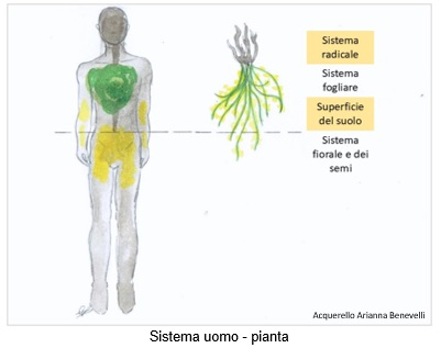 Il primo è il piano “cielo” corrispondente al sistema neuro-sensoriale e alla testa, rotonda come la volta celeste; poi si ha il piano “uomo” sito tra il piano diaframmatico e la gola e caratterizzato da visceri con funzioni più elevate e ritmiche come il respiro e la circolazione. Infine troviamo il piano sottodiaframmatico, del ricambio e delle membra che contiene i visceri, attribuiti all’elemento terra. Analogamente anche le piante, inclusa la ginestra, presentano una struttura tripartita: il polo della forma situato in basso (sistema radicale), il polo dei processi dissociativi, in alto, rappresentato dal sistema floreale e il sistema ritmico centrale fogliare che costituisce il punto mediatore.