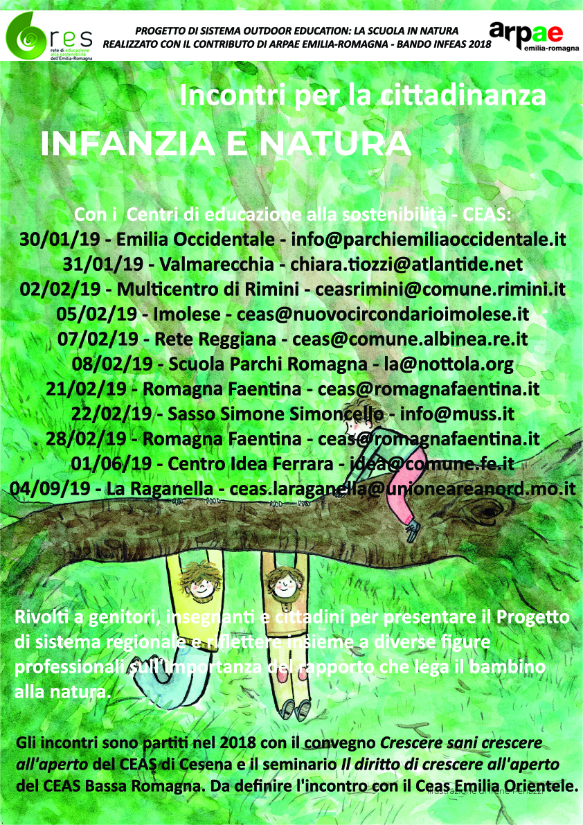 Il Progetto di sistema Outdoor education: la scuola in natura, finanziato da Arpae – CTR Educazione alla sostenibilità con il Bando Infeas 2018, coinvolge 20 Ceas e ha come capofila il Ceas della Fondazione Villa Ghigi che da anni porta avanti progettualità, ricerca e formazione su questo tema con il supporto di Michela Schenetti, ricercatrice del Dipartimento di Scienze dell’Educazione e direttrice del Corso di Alta Formazione Educazione e Natura dell’Università di Bologna. Gli obbiettivi sono appunto: informare, suscitare interesse, suggerire riflessioni, offrire soluzioni concrete, favorire un forte cambiamento di mentalità per un nuovo rapporto con la natura.